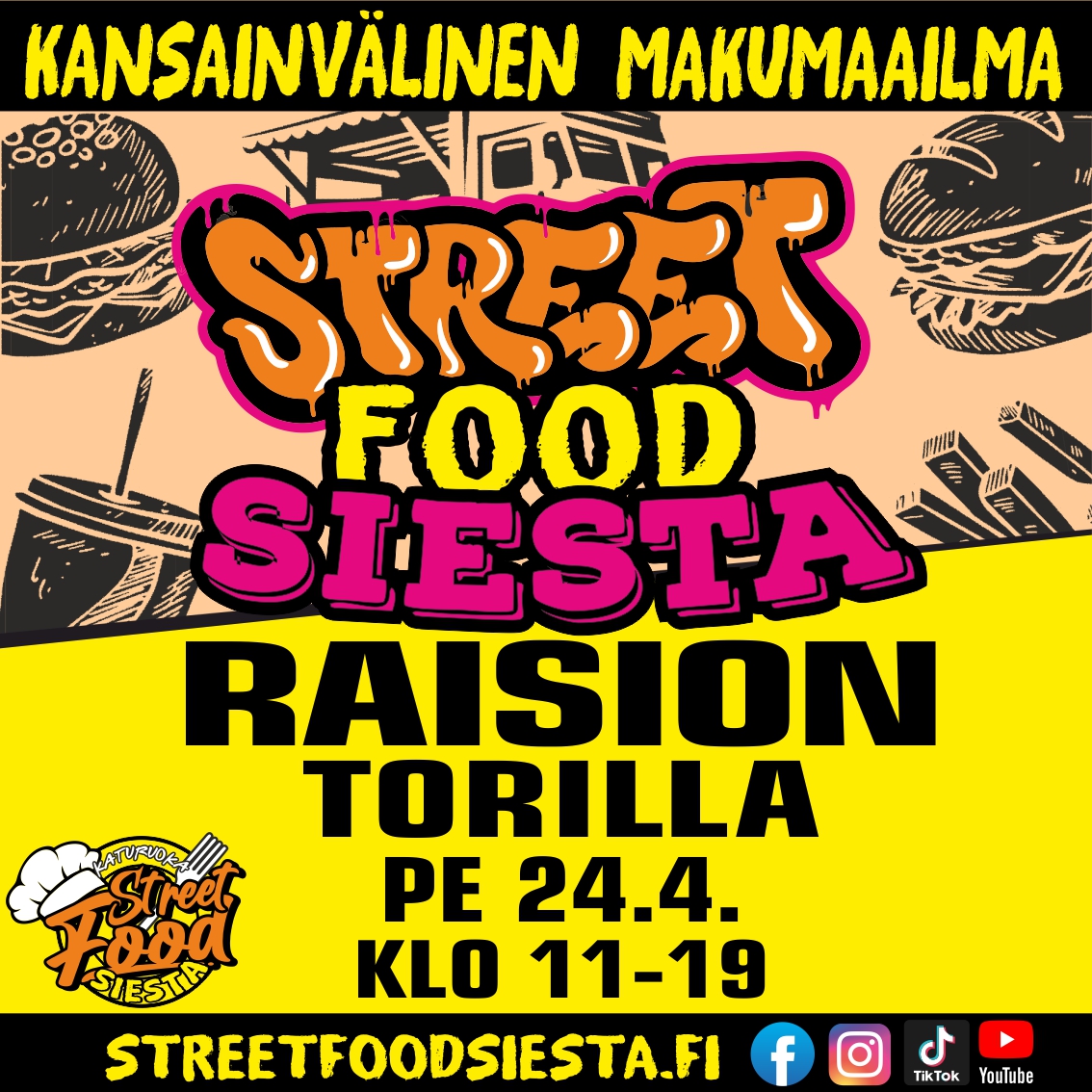 Tervetuloa herkuttelemaan.🤗🎉🎊 Annoksia saa myös mukaan tai paikanpäällä nautittavaksi.🫕🍲🤩 🇺🇲🇻🇪🇬🇷🇫🇮🇪🇺🇵🇷🇻🇳🇮🇩🇰🇭🇨🇵🇰🇷🇲🇽🇮🇳🇭🇺🇮🇹 Hauskahahmo paikalla klo 16:00-16:30 ja 17:00-17:30.(pe) paikka Raision tori.🤩 Klo 11-19👈pv 24.4.2026