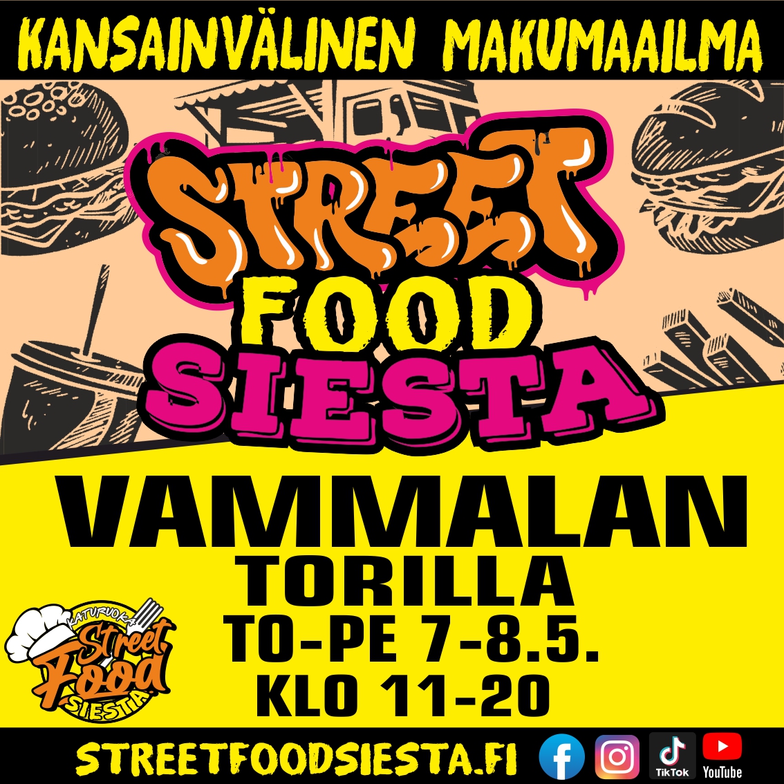 Tervetuloa herkuttelemaan.🤗🎉🎊 Annoksia saa myös mukaan tai paikanpäällä nautittavaksi.🫕🍲🤩 🇺🇲🇻🇪🇬🇷🇫🇮🇪🇺🇵🇷🇻🇳🇮🇩🇰🇭🇨🇵🇰🇷🇲🇽🇮🇳🇭🇺🇮🇹 Hauskahahmo paikalla klo 16:00-16:30 ja 17:00-17:30.(pe) paikka Vammala tori.🤩 Klo 11-20👈pv 7-8.5.2026